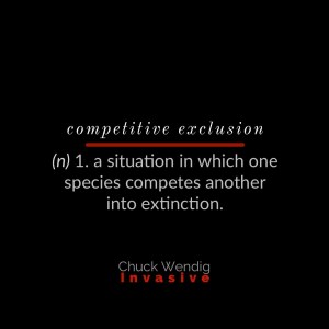 While I didn’t love the book itself, despite enjoying Chuck Wendig’s writing style and Xe Sands’ narration, there were certain elements of the story I found fascinating. One prominent idea in the novel was the concept of competitive exclusion, and regardless of what was happening in the book with genetically modified killer ants, it was a concept that grabbed my attention for its implications beyond the themes of futurism and doomsday/survivalist prepping. Eliminate the characters, the ants, the hi-tech monster story and the shell game of human monsters pulling strings throughout, and you still have this concept.