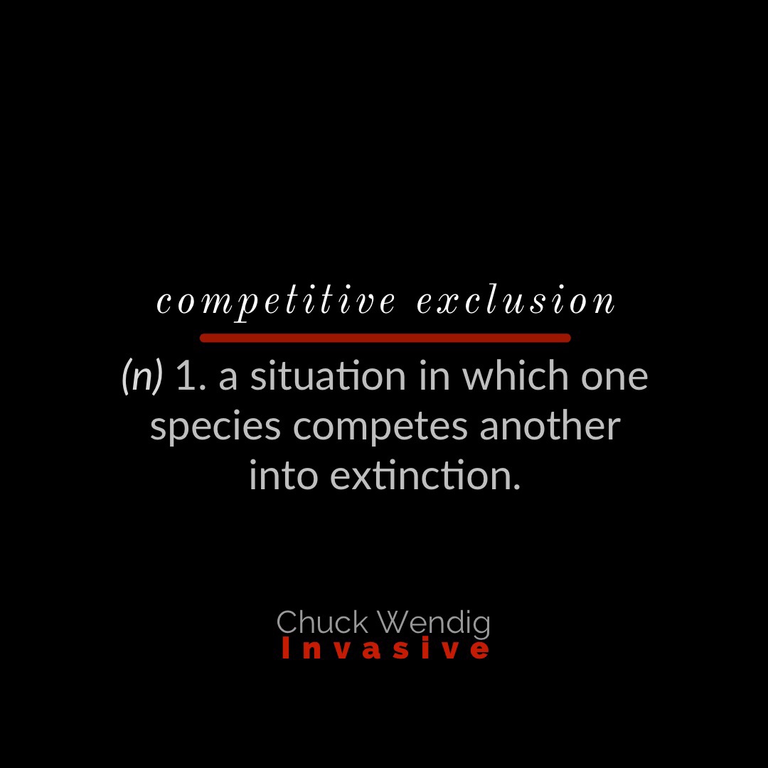 While I didn’t love the book itself, despite enjoying Chuck Wendig’s writing style and Xe Sands’ narration, there were certain elements of the story I found fascinating. One prominent idea in the novel was the concept of competitive exclusion, and regardless of what was happening in the book with genetically modified killer ants, it was a concept that grabbed my attention for its implications beyond the themes of futurism and doomsday/survivalist prepping. Eliminate the characters, the ants, the hi-tech monster story and the shell game of human monsters pulling strings throughout, and you still have this concept.