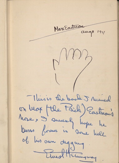 Hemingway later inscribed the book he had broken on Eastman’s face with, “This is the book I ruined on Max (the Prick) Eastman’s nose, I sincerely hope he burns forever in some hell of his own digging” which the critic kept in his personal collection for years.